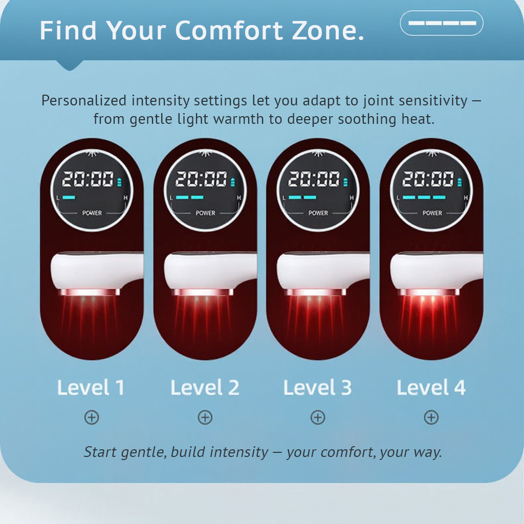 You control the intensity and duration — 4 levels and 5-, 10-, 15-, or 20-minute sessions — so relief adapts to your pain level, whether for morning stiffness or flare-ups later in the day.